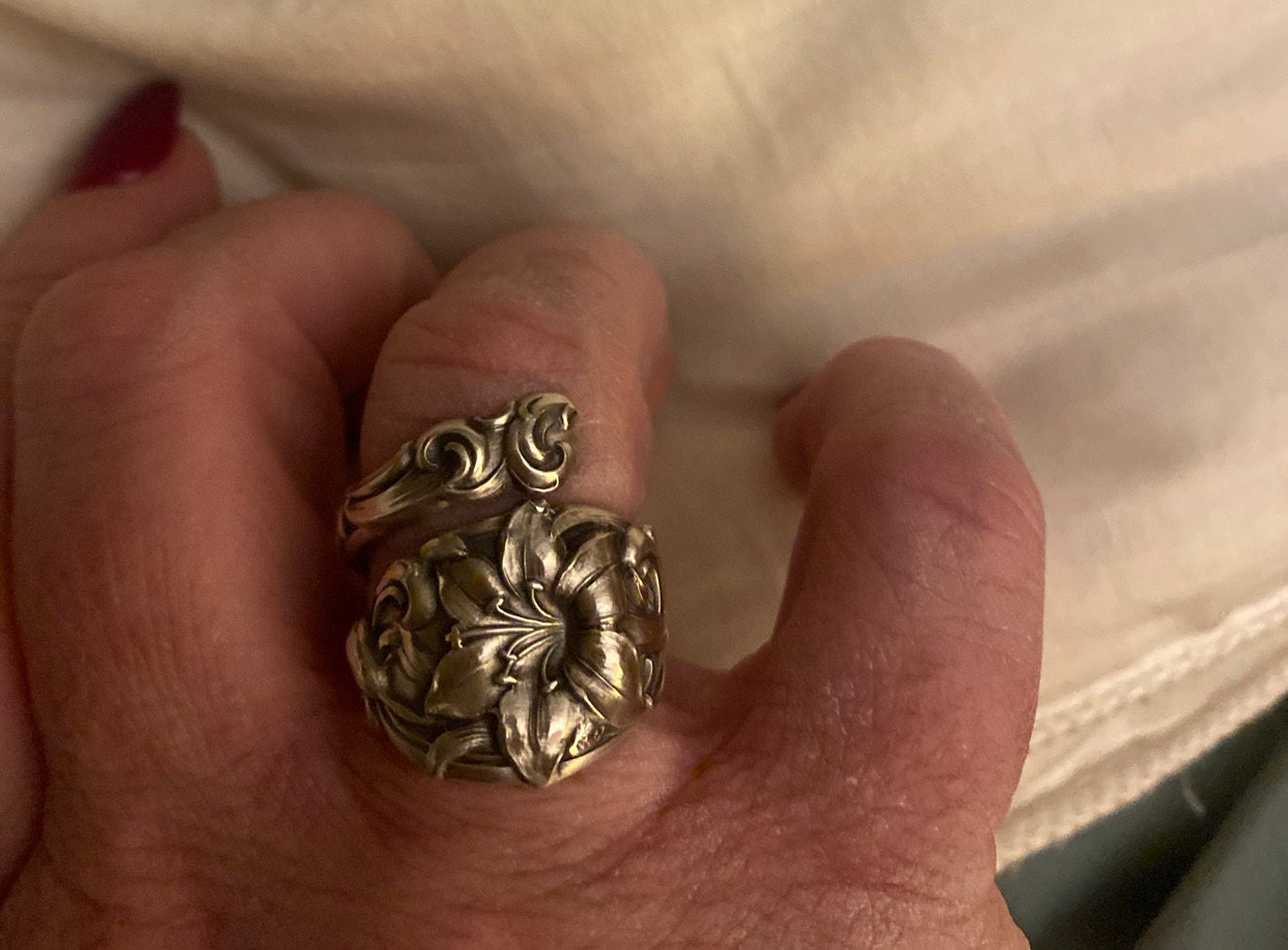 A unique Art Nouveau lily spoon ring! Originally a spoon pattern made by Alvin in the early 1900's, it features a beautifully detailed lily in a freeform design, this ring is sure to please nature and art lovers alike.