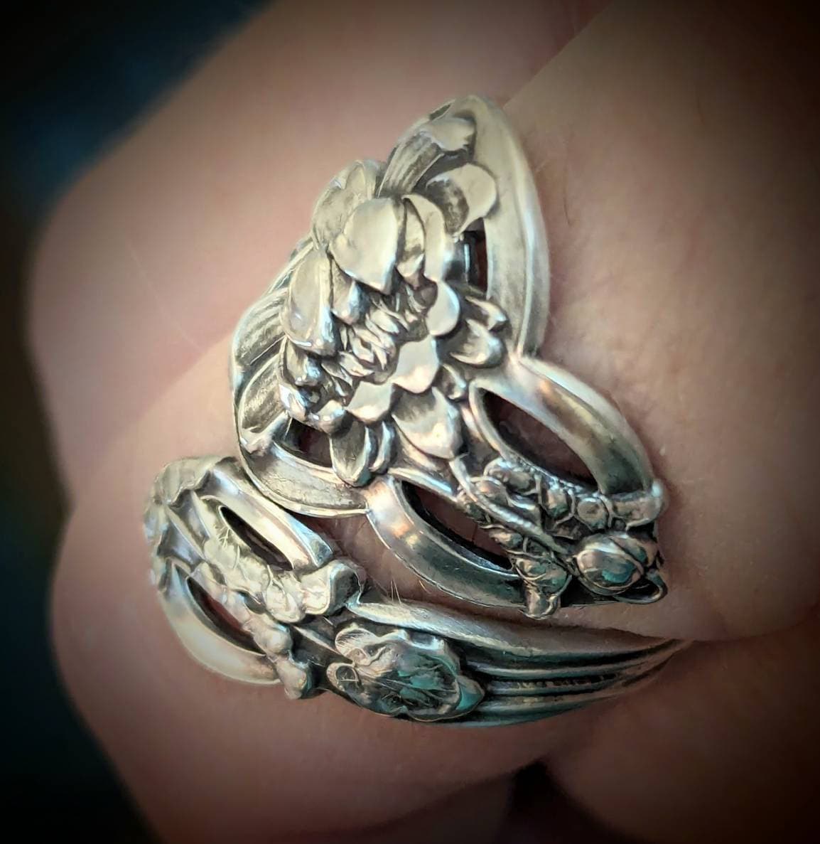 This ring is made from a vintage sterling silver spoon, 925, nickel-free. This ring will be adjusted to the size you request but it can easily be tightened or loosened at home should you want a different fit. As these are antique items, there may be minor wear and tear from its past life. Some rings may have engravings or marking. We do not offer any customization or marking removal at this time.