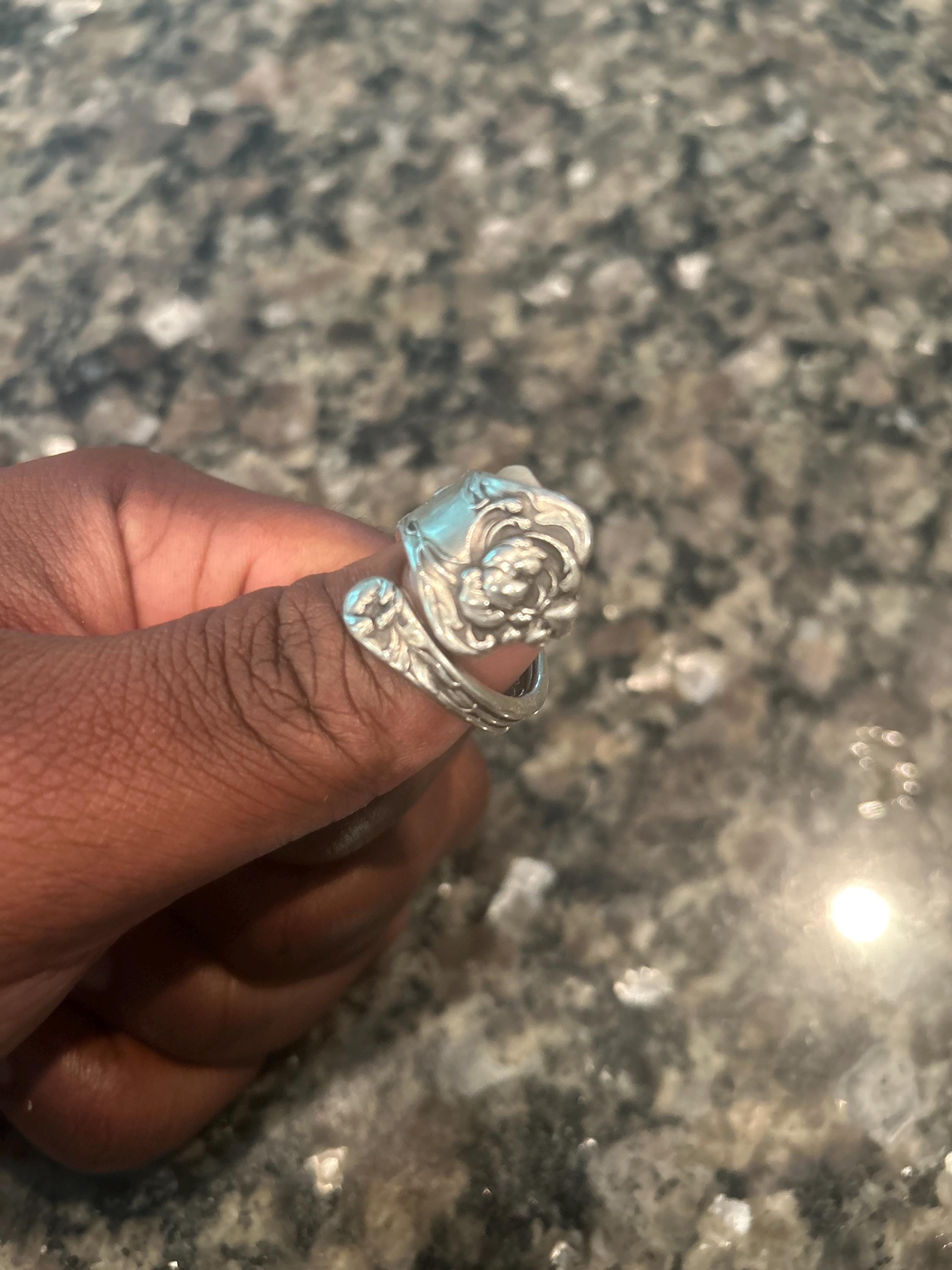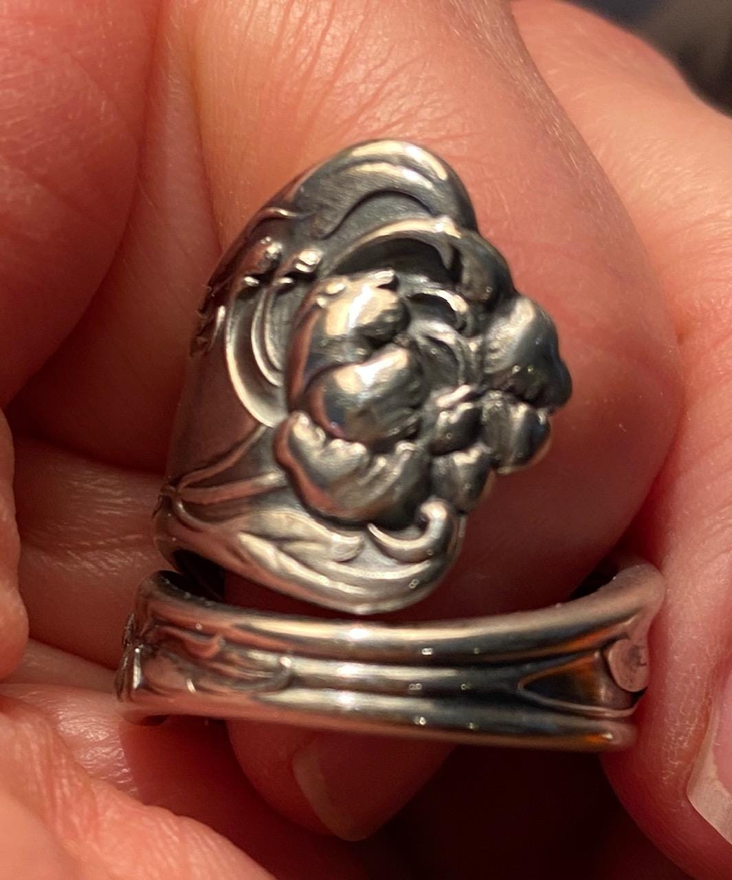 This ring is made from a vintage sterling silver spoon, 925, nickel-free. This ring will be adjusted to the size you request but it can easily be tightened or loosened at home should you want a different fit. As these are antique items, there may be minor wear and tear from its past life. Some rings may have engravings or markings. We do not offer any customization or marking removal at this time.