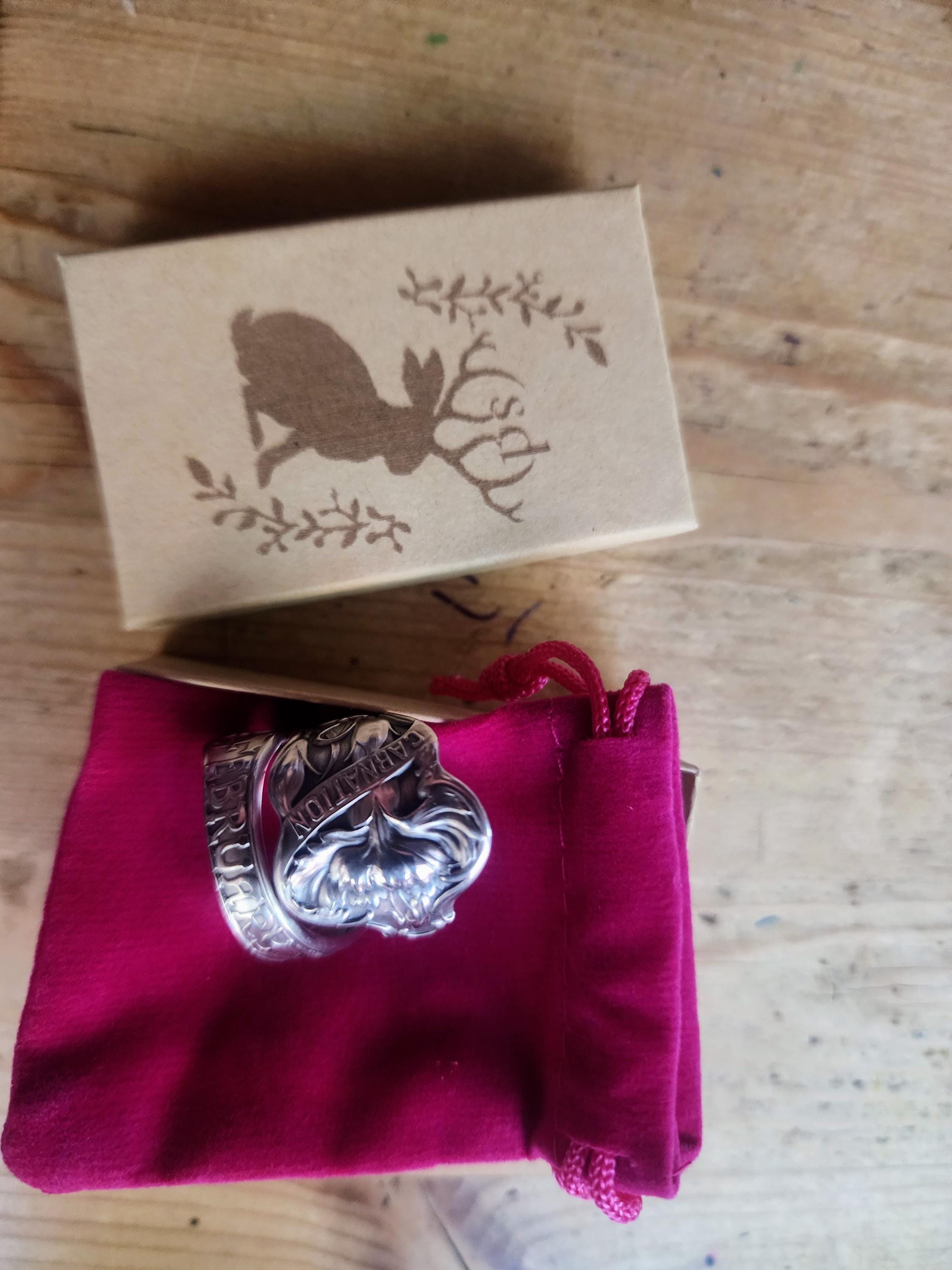 This ring is made from a vintage sterling silver spoon, 925, nickel-free. This ring will be adjusted to the size you request, but it can easily be tightened or loosened at home should you want a different fit. As these are antique items, there may be minor wear and tear from its past life. Some rings may have engravings or markings. We do not offer any customization or marking removal at this time.